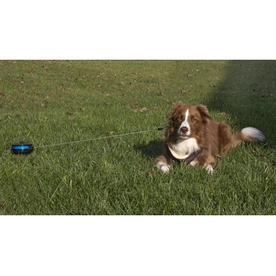 Rollijn met bodempin Dit is een handige rollijn voor gebruik buitenshuis. U zet de hond vast aan deze intrekbare rollijn nadat u de rollijn met behulp van de grote pin in de bodem stevig heeft vastgezet. De staalkabel kan 360 graden in het rond roteren, trekt strak maar blijft comfortabel voor de hond. De lijn kan niet in de knoop schieten. Leverbaar in de volgende maten: Maat Lengte kabel Kleur Max. gewicht hond S 4,5 meter zwart – geel 0 – 15 kg M 4,5 meter zwart – blauw 11 – 36 kg L 4,5 meter zwart – rood 36 – 55 kg