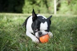 Hondenspeelgoed Zogoflex Jive Oranje Dit hondenspeelgoed is speciaal geschikt voor de stevige kauwer. Door de vormgeving zal de Jive alle kanten uit stuiteren zodat uw hond er veel plezier aan zal beleven. Het hondenspeelgoed is gegarandeerd niet giftig en milieuvriendelijk – het is 100% recyclebaar. De fabrikant geeft 100% garantie op het product: als uw hond het kapot krijgt, wordt het gratis eenmalig omgewisseld voor een nieuw exemplaar. De Jive vliegt, stuitert en drijft in water. U kunt het zonder enig probleem in de vaatwasser reinigen. Kleur: oranje. Leverbaar in de volgende maten: Maat Diameter XS 5,0 cm S 6,5 cm L 8,0 cm